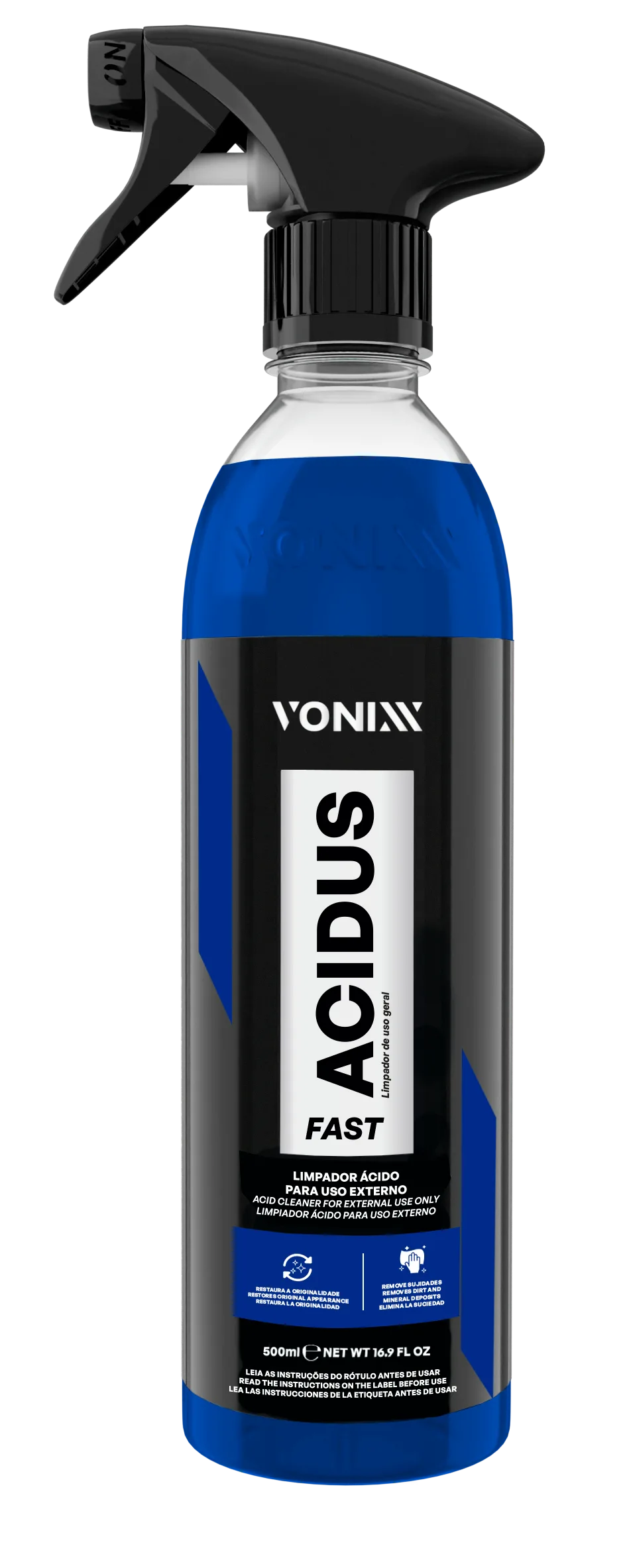 ACIDUS FAST é um limpador ácido automotivo de alta performance, desenvolvido para remover sujeiras minerais em rodas, chassis, emblemas, plásticos externos e metais. Sua fórmula balanceada permite restaurar a originalidade de diversas áreas do veículo, eliminando marcas d'água leves em vidros e pinturas, além de poder ser utilizado na limpeza de motores e detalhes de difícil acesso, grades e contornos.